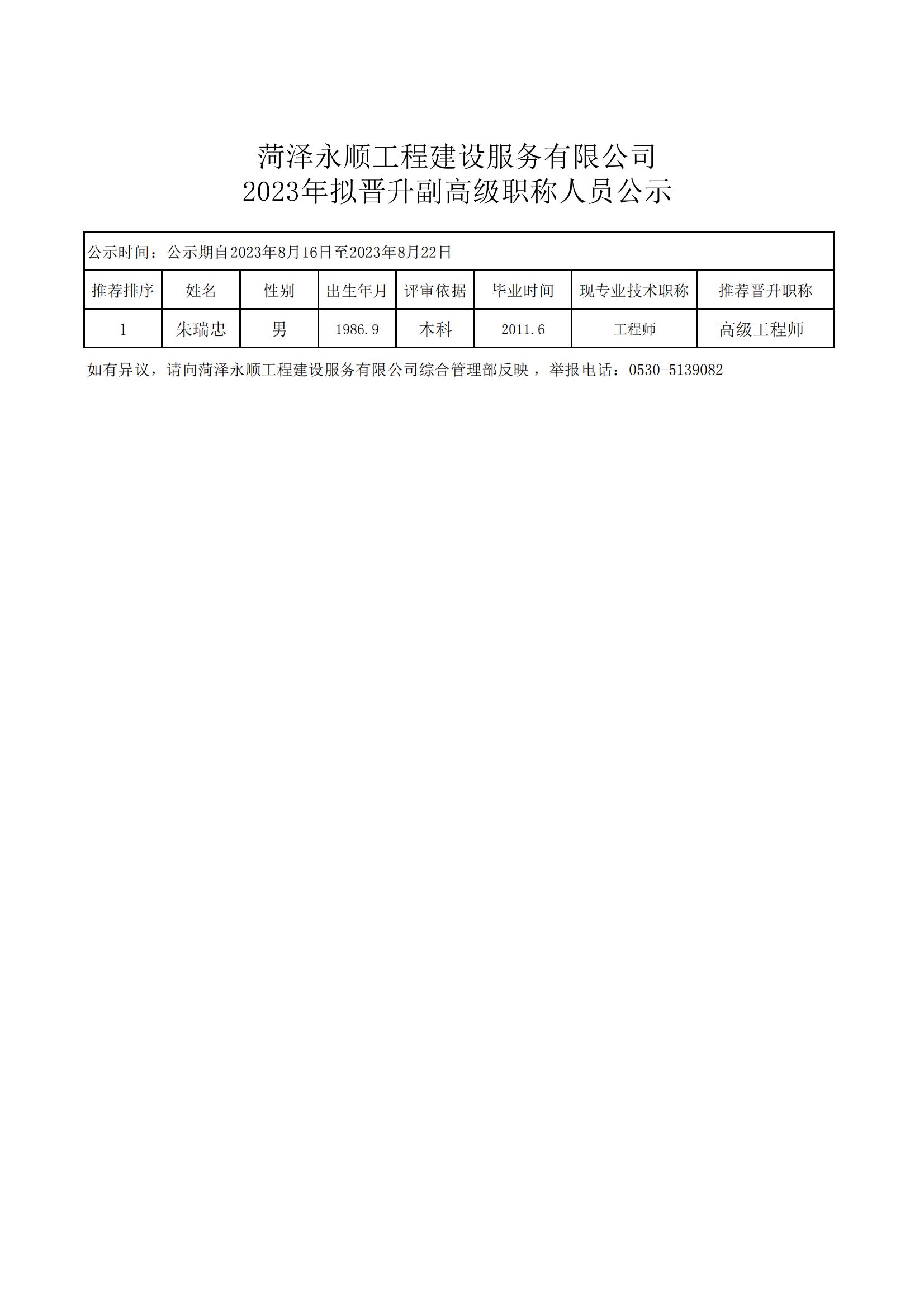 菏澤永順工程建設(shè)服務(wù)有限公司 2023年擬晉升副高級職稱人員公示