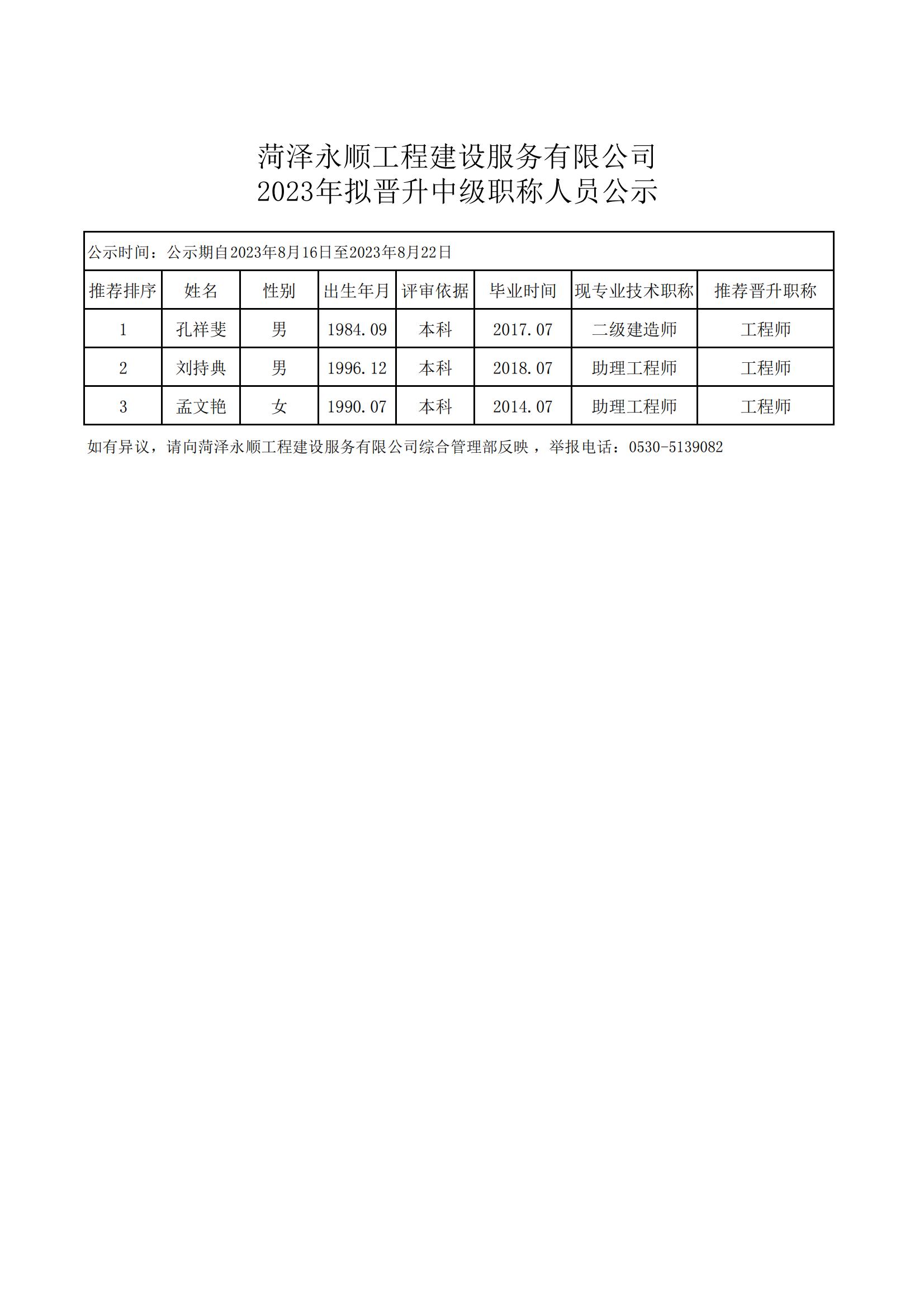 菏澤永順工程建設服務有限公司 2023年擬晉升中級職稱人員公示